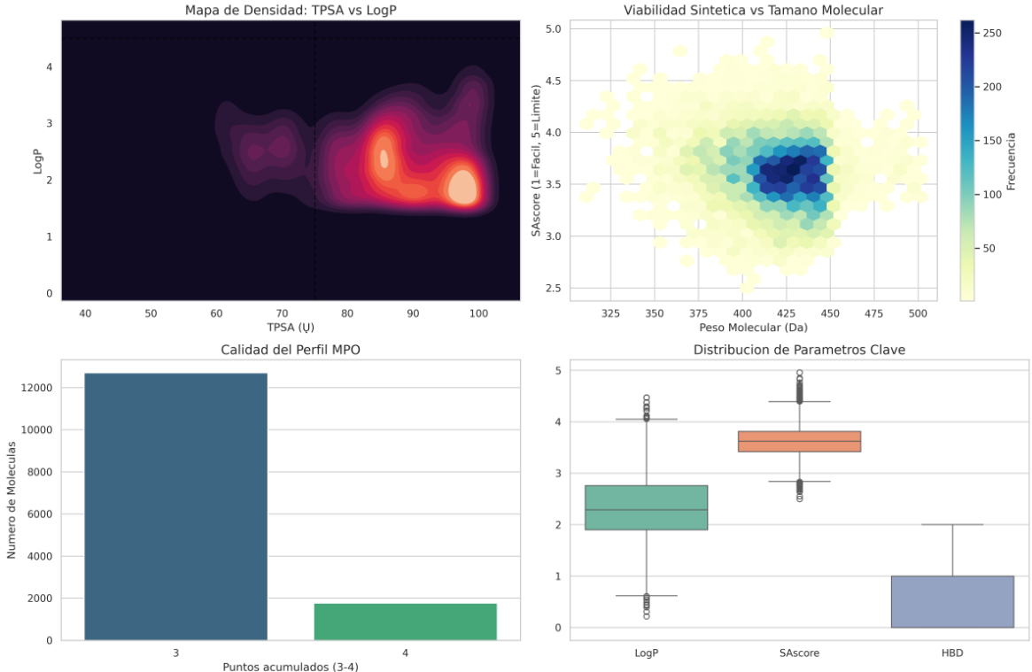 Vamos a concentrar la potencia de cálculo (1000 rounds por ligando) en los 1.800 candidatos "perfectos" usando GPU. Estas moléculas no sólo cumplen con la farmacofonía del SNC, sino que tienen el balance físico-químico ideal.